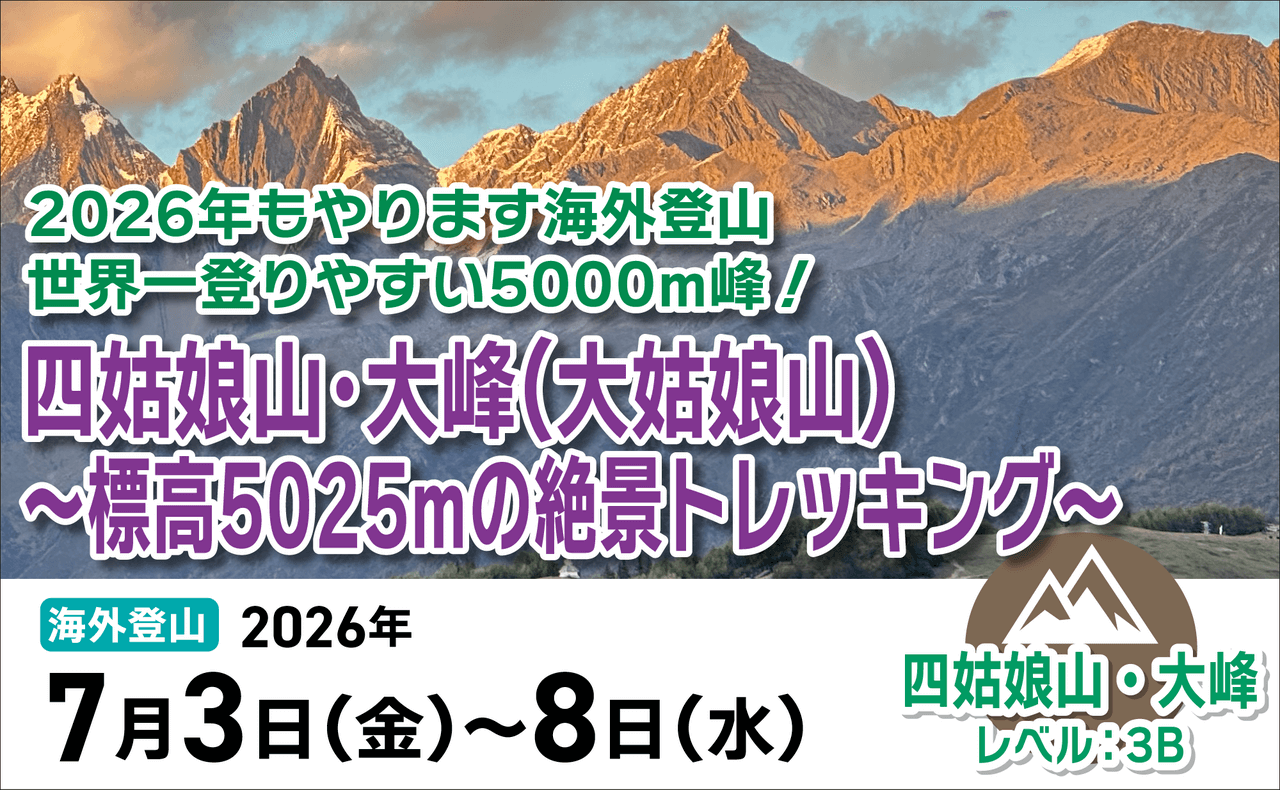 絶賛受付中! 7/3(金)~8(水) 【海外登山】世界一登りやすい5000m峰!四姑娘山・大峰(大姑娘山) ~標高5025mの絶景トレッキング~