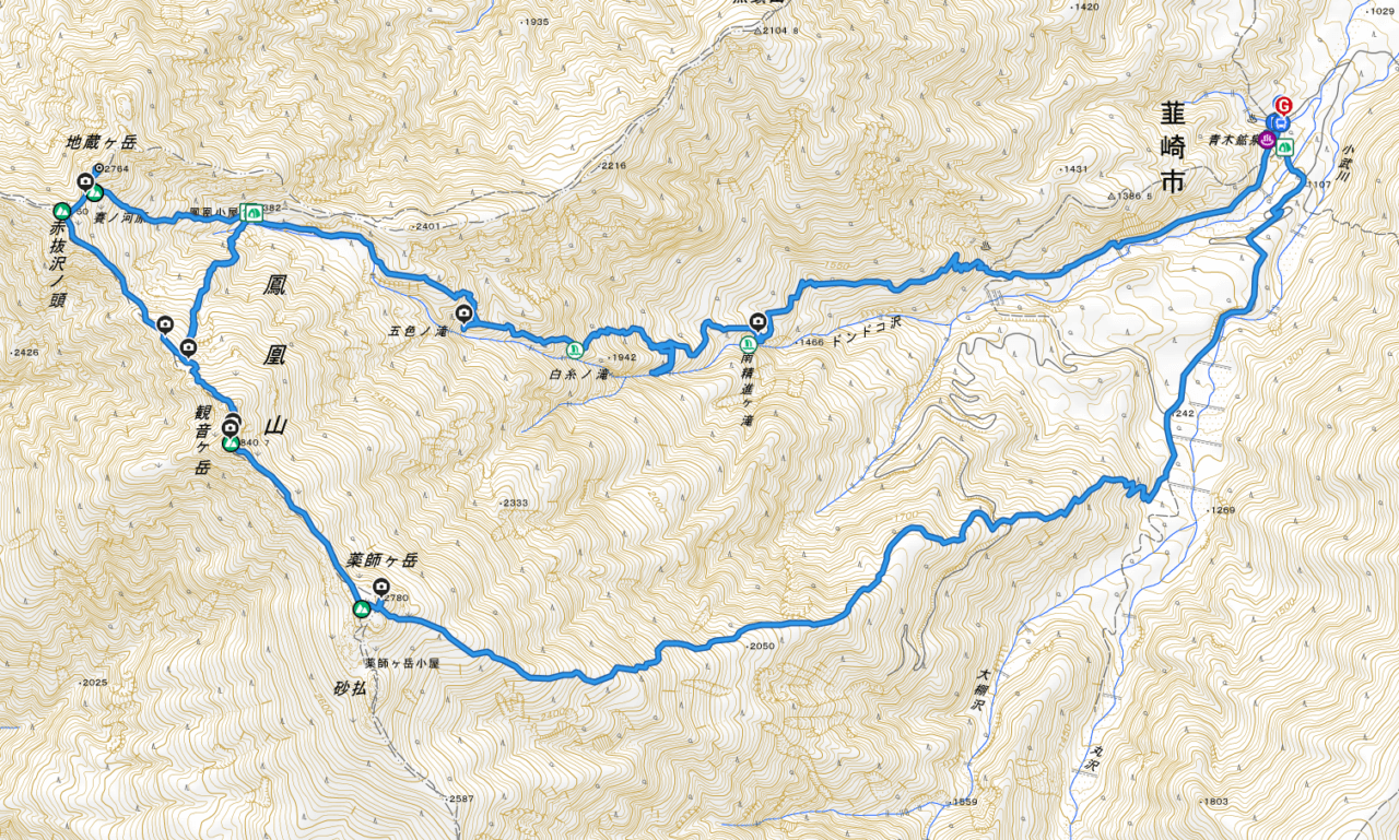 初日は青木鉱泉からドンドコ沢ルートを詰めて鳳凰小屋へ。山小屋に宿泊し、翌日は3つのピークを踏みながら青木鉱泉へと下る充実の2日間です。